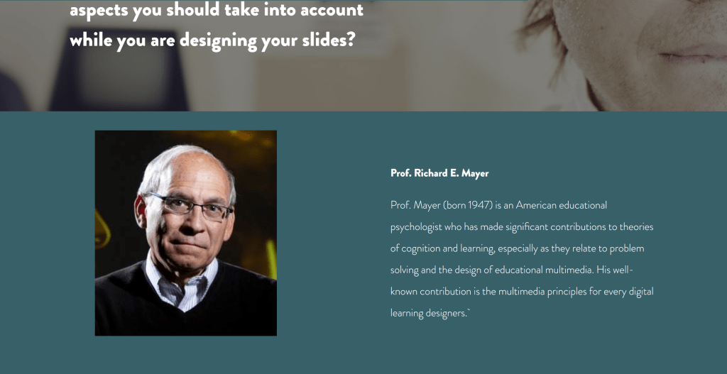 However, to pinpoint one single learning block or element, Mayer’s 15 multimedia principles offer the instructional designers the best format to design the layout. Students can scroll through different principles to understand the application. I cited Andrew DeBell’s comparison pictures to help our students understand the differences between with and without the application of Mayer’s multimedia principles.